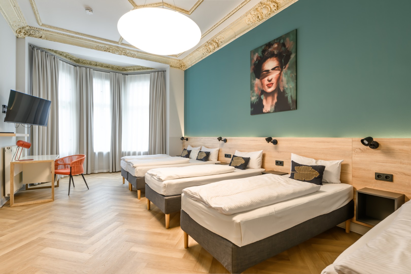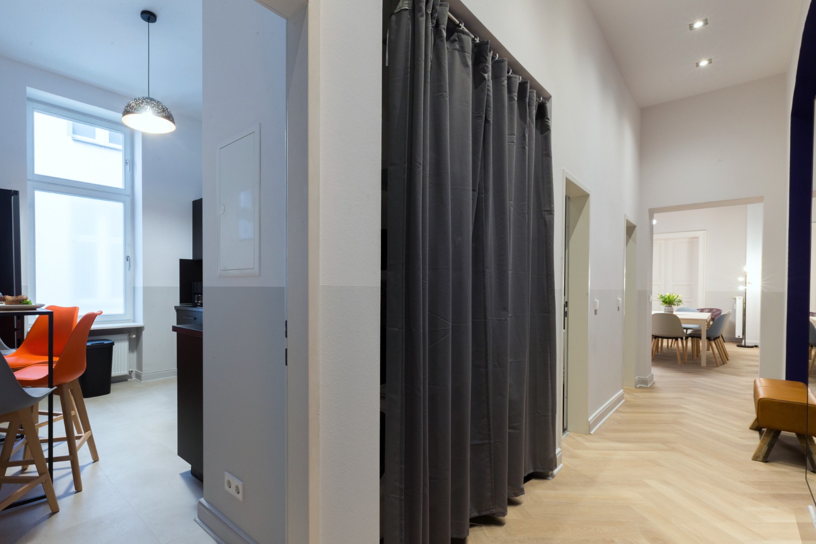Die drei weitläufigen Schlafzimmer bieten mit ihrer klaren Aufteilung den perfekten Rückzugsort für bis zu 12 Personen. Ausgestattet mit einer Mischung aus gemütlichen Doppel- und Einzelbetten, genießen Sie hier Privatsphäre und Stille mitten in der Stadt. Das harmonische Design und viel Platz sorgen für eine beruhigende Atmosphäre, die nach einem ereignisreichen Tag sofortige Entspannung verspricht.